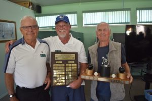 Battle of the Sexes September 20 & 21. The coveted Salmon Can Trophy went to the men this year. Andrew Adamson & Bob Merrell accepted the Gloria Wilcox Men’s Triples Trophy on behalf of their winning team. Trevor Motley and Murray Sinclair were unable to attend.